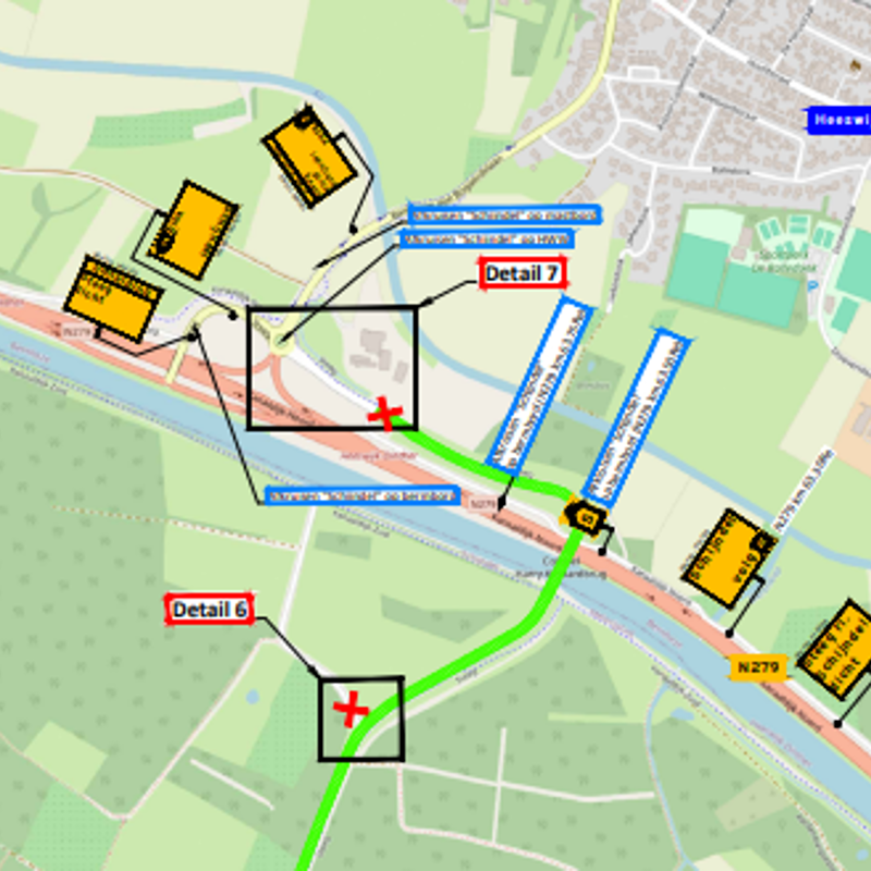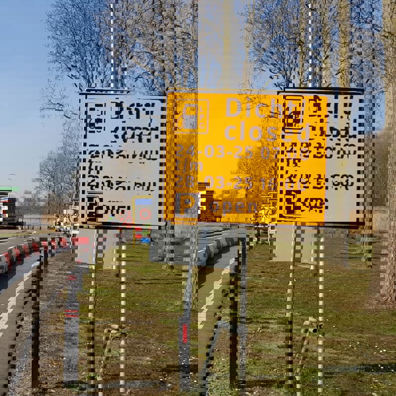 We maken zelf het verkeersplan, tekenen de benodigde situaties uit en regelen de borden — van ontwerp tot plaatsing. Dat doen we zowel binnen als buiten de bebouwde kom. Waar nodig werken we samen met onze vaste partner Traffic Service Nederland (TSNed).